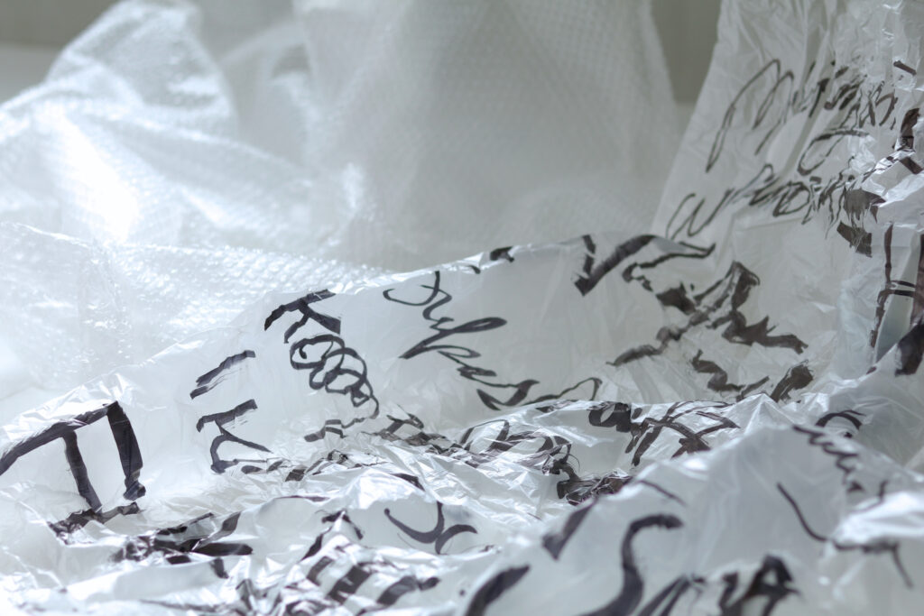 無機質で現代的なビニールに、義経や水主たちの声をマーカーで書き表す。この筆跡は、平曲の節を映すと同時に、私自身の呼吸や間の記録でもあります。声から文字へ、過去から今へ。時を越えて交わる音の軌跡。今後もさまざまな登場人物たちと対話を重ねていきたいと思います。