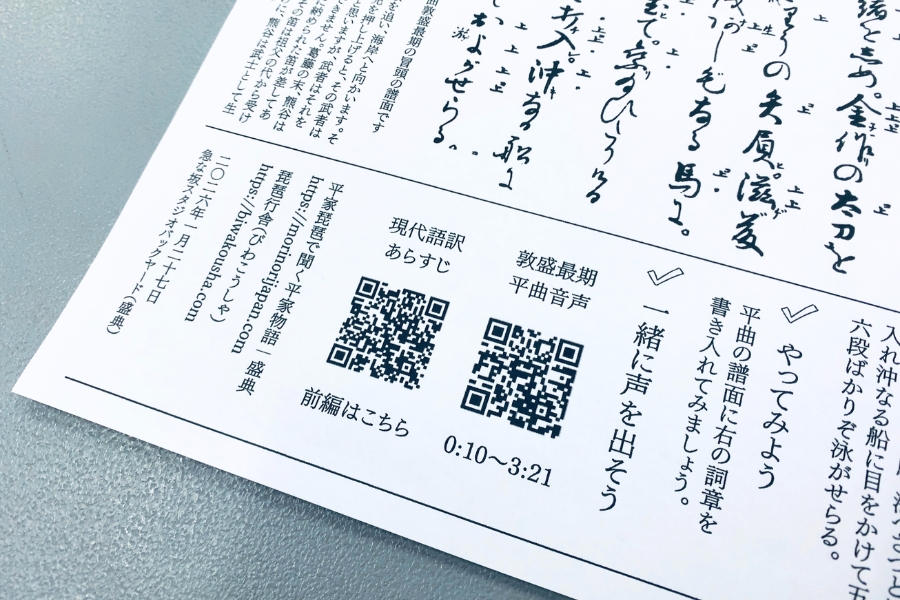 琵琶行舎のワークショップで配布するワークシートの構成を検討しています。譜面を一緒に読んだり、声に出したりする入口として、一枚で複数の使い方ができる場面を想定しています。
